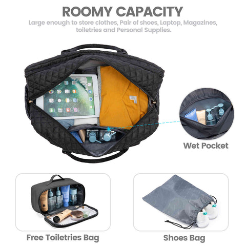 - Gran capacidad: 1 compartimento principal grande, un compartimento separado para computadora portátil y muchos bolsillos. Viene con un neceser y una bolsa para zapatos.
